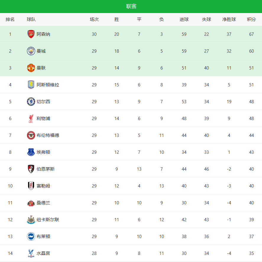 本轮另一场焦点战,切尔西4-1大胜阿斯顿维拉,强势回到前五;卫冕冠军利物浦紧追其后。曼联虽然暂列第三,但领先第六名利物浦仅3分。4支球队之间的差距,被压缩到一个胜场之内。争四,进入白刃战。